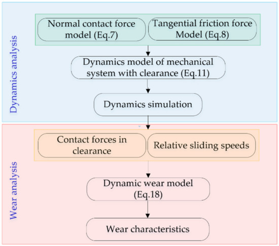 In order to analyze the wear characteristics in clearance joints of mechanisms, two main steps are presented, which are: dynamics analysis of mechanisms with clearances, and wear analysis of clearance joints. Firstly, the dynamics characteristics of mechanisms with clearances are analyzed. The contact forces of clearance joints and the sliding velocity between the journal and bearing are obtained. Secondly, the wear depth of clearance joints is calculated based on the dynamic wear model of Equation (18).