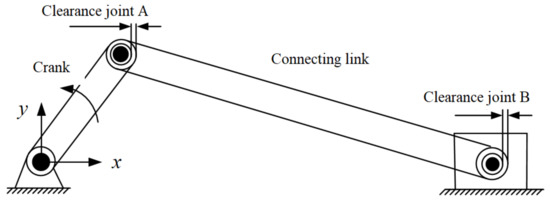 In this section, a planar slider-crank mechanism with two revolute clearance joints is used to represent the investigation. Figure 4 depicts the configuration of the planar slider-crank mechanism, in which two revolute clearance joints exist between the connecting rod and the slider as well as the crank. They can also be called revolute joint A and revolute joint B. The connecting rod is considered as a flexible link, and the crank and slider are considered as rigid bodies.