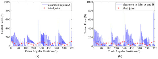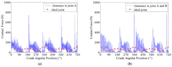 Contact forces in revolute clearance joint A. (a) case 1: there is one clearance joint in the mechanism; (b) Case 2: there are two clearance joints in the mechanism.