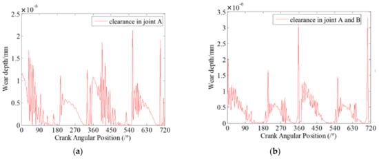 Dynamic wear depth in revolute clearance joint A. (a) case 1: there is one clearance joint in the mechanism; (b) Case 2: there are two clearance joints in the mechanism.