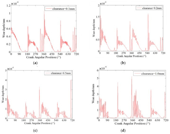 - Different clearance sizes present a similar dynamic wear phenomenon, but the wear depths of the clearance joints are obviously different. When the clearance size is smaller, the wear level is weaker and the maximum wear depth is smaller. As the clearance size increases, the wear level is more severe and the maximum wear depth increases;