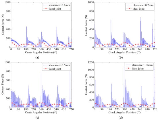 It can be seen from Figure 7 that the dynamic wear depths of clearance joint A are changing with the motion of the mechanism, which indicates that the clearance joint exhibits non-uniform wear during one motion cycle of the mechanism. Comparing the four case studies with different clearance sizes, it clearly shows that different clearance sizes present similar dynamic wear phenomenon, but the wear depths of clearance joints are obviously different. When the clearance size is smaller, the wear level is weaker, and the maximum wear depth is smaller. As the clearance size increases, the wear level is more severe and the maximum wear depth increases. When clearance size is 1 mm, the maximum wear depth is about 3.2 times the wear depth when clearance size is 0.2 mm. The reason is that as the clearance size increases, the journal and bearing contact and impact severely, causing a larger contact force in the clearance joint, as shown in Figure 8. The contact forces in clearance joint are one of the most important factors causing wear. Therefore, the clearance size is one important factor affecting the wear characteristics of clearance joints in mechanisms, which cannot be ignored and must be strictly controlled in the design of mechanisms.