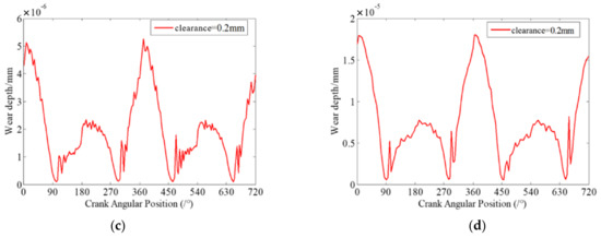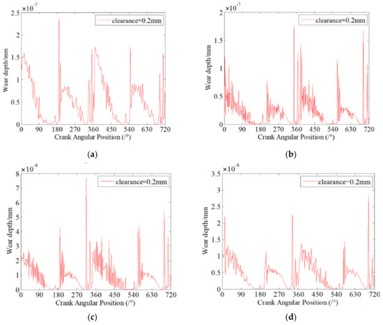 Dynamic wear depth in revolute clearance joint A for different driving speeds. (a) 200 rpm; (b) 300 rpm; (c) 400 rpm; (d) 600 rpm.