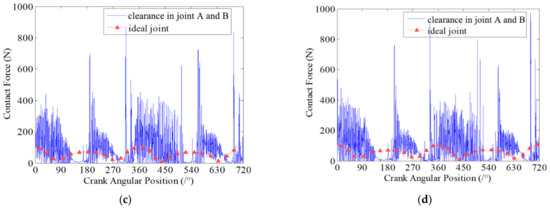 Contact forces in revolute clearance joint A for different cases. (a) 1 × 106 N/mm; (b) 5 × 106 N/mm; (c) 1 × 107 N/mm; (d) 5 × 107 N/mm.