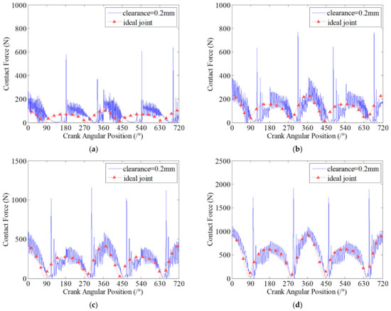 Contact forces in revolute clearance joint A for different driving speeds. (a) 200 rpm; (b) 300 rpm; (c) 400 rpm; (d) 600 rpm.