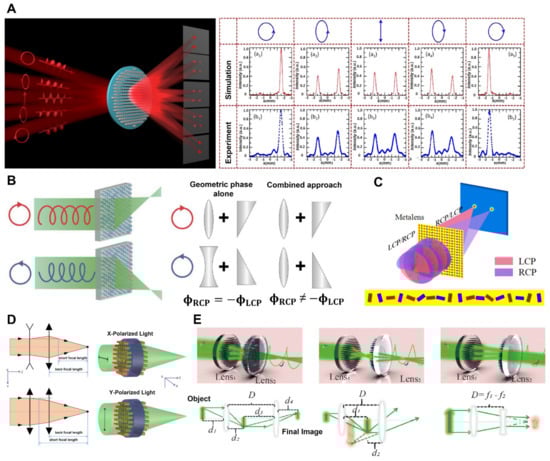 Tunable metalenses can be used to adjust the feature of a light source, such as polarization. The intensity of the focal point in these metalenses can be controlled by changing the circular polarization state of the incident beam. Moreover, the generation of multiple focal points can be grasped by the ellipticity of the incident beam. Spin-decoupled metalenses were created by combining the characteristics of many convex and concave lenses into a single metasurface utilizing the PB phase. One phase profile focuses on incoming LCP light, while the other profile focuses on incoming RCP light [110]. As a result, the focus point shifts as the polarization of the incoming light changes; Figure 6A (left). Furthermore, by adjusting the ellipticity of the input light, the intensity of various focus sites may be controlled, as illustrated in Figure 6A (right). It is easier to construct a spin decoupled metalens utilizing just the geometric phase rather than both the propagation and geometric phases since there is no need to scan many parameters. However, the recommended metalens provides 50% efficiency, which is not promising. The light at two different focal points can be focused by the metalens depending on the spin state of the input light. The PB phase implements the required phase profile in a silicon nano brick unit structure. When the spin state of the incoming light changes, two silicon nano bricks (red and blue on the metalens) function as a curved lens or a bowl-shaped lens, as shown in Figure 6B [111]. These spin-selected metalenses may be used for spin-controlled photonics and detection techniques. Moreover, an example of a step-zoom metalens is demonstrated in Figure 6C [112]. The focal distance varied with respect to the polarization of the incoming light. A metalens with two focal distances utilizes metasurfaces on both sides. When the y-polarized beam is incident, both metasurfaces function as convex lenses, while in the case of x-polarized light, one metasurface works as concave, and the second functions as convex, as demonstrated in Figure 6D [113]. This type of metalens design approach is compact, simple, and flexible and has promising potential for application in the field of bioengineering, optical communication, and wearable electronics technology. Moreover, it has been claimed that a metalens doublet can accomplish different functions depending on the polarization of the incoming light and the distance between the two lenses. Changing the incoming beam’s CP state and the distance among the lenses can perform as a three-function doublet, as illustrated in Figure 6E [114]. Since no separate optical components are employed for multifunctional metalens doublet, it simplifies and reduces the size of the imaging setup. Consequently, it has a lot of potential for use in compact imaging devices.