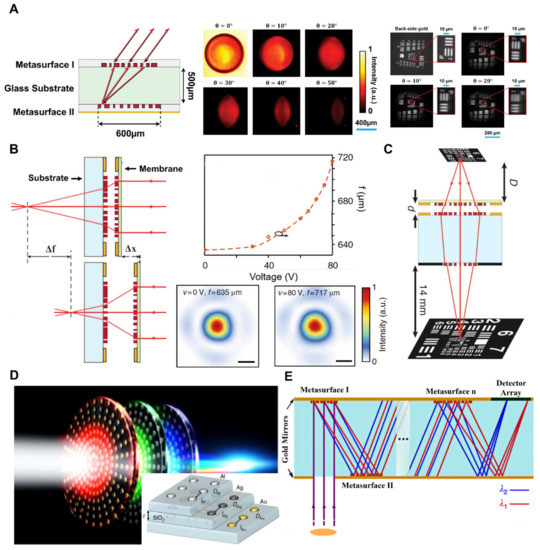 (A) Schematic illustration planar retroreflector consists of bi-metasurfaces deposited on opposite sides of the glass substrate (left) [124]. The device’s measured reflectance as a function of incoming angle brightness intensity (middle). Images of the entity in the back-side gold mirror and the retroreflector were calculated based on the angle of rotation retroreflector (right). (B) Tunable dielectric lens comprises two metalenses cascaded at a variable distance. One lens is fixed on a substrate, and the second one is moving on a membrane (left) [55]. The calculated front focal length against input DC voltage (right top) and at various actuation voltages, intensity distributions in the focal plane of the doublet lens (right bottom). (C) Displays that adding an aperture in a single tiny composite metadevice, metalens in front of a focusing metalens, can accurately correct the aberrations and accomplish the functions of a Chevalier landscape lens with a resolution near the diffraction limit [55]. (D) The three-layer lens depicted in this illustration. Each layer’s assigned spectrum portion is targeted to a length of 1 mm along the optical plane when lit with white light. The layered structure schematic is shown in the inset (images captured using a scanning electron microscope [125]. (E) An ultrafine spectrometer consists of several folded metasurfaces. Even more intriguing, rather than a straight vertical stack, metasurfaces might be folded serially inside the optical path. In the case of numerous metasurfaces, this method may further decrease the device footprint, resulting in spectrometers with ultrafine resolution and extremely thin thicknesses [126]. (A) Reprinted/adapted with permission from Ref. [124]. Copyright 2017, Springer Nature. (B,C) Reprinted/adapted with permission from Ref. [55]. Copyright 2017, Springer Nature. (D) Reprinted/adapted with permission from Ref. [125]. Copyright 2017, Springer Nature. (E) Reprinted/adapted with permission from Ref. [126]. 2018, Springer Nature.