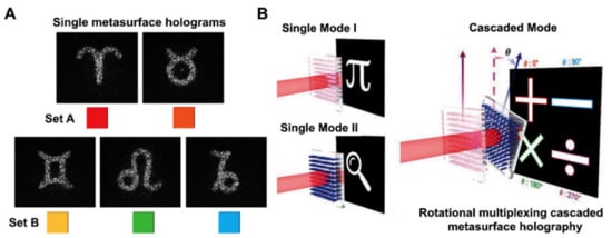 (A) Holographic encryption scheme. A “master share” metasurface hologram with three separate “deputy shares” is shown. On one substrate (set A), the researcher created two master share metasurface holograms and three deputy share metasurface holograms (set B). Fourier holograms for the astrological sign are encoded by a combination of metasurfaces of both sets and stacks. Each metasurface hologram has its own color for easier visualization. Measured cascaded metasurface holographic images are almost as good as their single-layer counterparts [133]. (B) The rotating multiplexing cascaded metasurfaces are seen schematically. Six different holographic pictures can be reconstructed using single-layer approaches I and II and the cascaded approach [134]. (A) Reprinted/adapted with permission from Ref. [133]. Copyright 2021, American Association for the Advancement of Science (AAAS). (B) Reprinted/adapted with permission from Ref. [134]. Copyright 2022 Wiley-VCH.