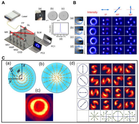 (A) Experimental setup for CVV beams (right). (a) Illustration of metasurface utilized in the experiment. (b,c) theorical estimated optical plane distribution of metasurface for q = 1 and q = 2 respectively. (d) The measured intensity distortion of the CVV beams with respect to wavelength [141]. (B) (a–d) display the measured intensity distribution of CCV beams with opposite sign of polarization orders (m) and charges (l). Polarization order is positive when the light spot’s rotation direction matches GL’s transmission axis rotation direction. As indicated by the red color dotted line, once two light spots on a similar diameter make an “s” shape, the charge is positive; when they form an anti “s” shape, the charge is negative (left) [141]. (C) Insets (a,b) show schematics of metasurfaces. A nanoscale waveplate with spatially changeable fast axis orientations is used to create nanograting based on variable space. Inset: (c) The intensity profile of the CVV beams shows doughnut characteristics. (d) CVV beams are created experimentally when GLP1 is positioned at 45 degrees. The polarization direction of the Glan laser polarizer (GLP3) is displayed in the first column line. Polarization angles from polarization analyzers are given in the four columns of data below, and the lower rows show rebuilt vector fields for the output beams [142]. (A,B) Reprinted/adapted with permission from Ref. [141]. Copyright 2017 IEEE. (C) Reprinted/adapted with permission from Ref. [142]. Copyright 2014 Optica Publishing Group (OPG).
