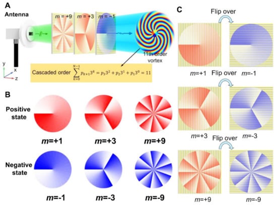 Recently, the researchers demonstrated the generation of a vortex beam with a large topological number by cascading three metasurfaces, as demonstrated in Figure 11. The reconfigured vortex beam generation is stimulated by the idea of the base-3 concept [143].