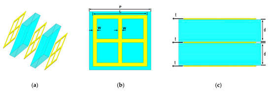 The designed wide-stopband filter in this paper consists of a metal-dielectric-metal-dielectric-metal (MDMDM) five-layer structure as shown in Figure 1. The three metal layers have the same structure, and the metal material is a gold thin film with a conductivity of 4.561 × 107 S·m−1. The polyimide is utilized as a dielectric layer with permittivity and loss tangent of ε = 3.5 and tan δ = 0.02, respectively. All parameters of the designed MDMDM structure are set as shown below: cell period P = 125 μm, length of the metal ring L = 110 μm, width of the metal ring w = 8 μm, thickness of the dielectric layer d = 20 μm, and thickness of the metal layer t = 1 μm.