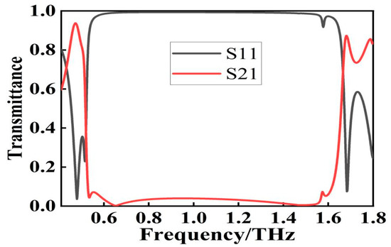 The broadband filter designed in this paper is computer simulated and optimized using the frequency domain solver of CST Microwave Studio. In order to simulate an infinitely periodic cell, periodic boundary conditions are selected along the x-y plane during the simulation, while open boundary conditions are selected along the z plane during the simulation. In addition, the electric (E) and magnetic (H) fields are parallel to the incident plane, while the propagating wave vector (k) is perpendicular to the structure plane. To explore the filtering performance of this filter, the transmission coefficient of the normal incident wave is focused on. The transmission curves are obtained by simulation as shown in Figure 2. The simulation results show that the center frequency of the filter is 1.08 THz, the −20 dB bandwidth can reach 1.07 THz, and the average transmission rate of the stopband does not exceed 5%. Since the designed filter has a steep cut-off performance, the rising-edge or falling-edge slope cannot accurately describe the filter performance. Here we use the squared ratio that can be used to quantitatively describe the steep cut-off performance of the filter, and the formula to calculate the squared ratio is: