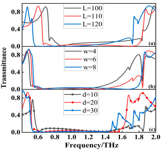 Transmittance spectra at different geometric parameters: (a) L = 100, L = 110 and L = 120; (b) w = 4, w = 6 and w = 8; (c) d = 10, d = 20 and d = 30.