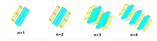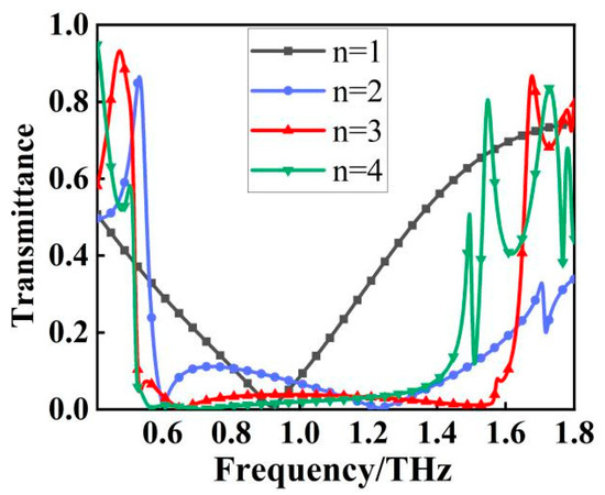 The goal of this paper is to construct a filter that displays broadband characteristics. We gradually stacked the designed metallic structure from one layer to four layers, as shown in Figure 4. The transmission spectra appear significantly different as the number of metal layers (n) increases. As shown in Figure 5, for a single layer (n = 1), resonance occurs at f = 0.92 THz and is a single resonance. When n = 2, it changes from a single resonance to multiple resonances, and the transmission spectrum is formed by the joint action of multiple resonance points. Similarly, for three layers (n = 3), the transmission spectrum is also formed by the joint action of multiple resonant points with resonant frequencies of 0.53, 0.66, 1.52, and 1.57 THz, respectively. It is worth noting that these apparent multi resonant spectral responses originate from the longitudinal coupling between different layers along the transmission direction, resulting in a wider stopband, better stopband performance, and steeper rising and falling edges of the stopband [18]. As shown in Figure 5, the stopband bandwidth starts to stop widening when n = 4, resulting in the characteristics of a broadband stop filter. Compared with n = 3, the filter bandwidth becomes smaller at n = 4, although the filter has better stopband performance, but the overall filter the out-of-band rejection is much less effective than at n = 3, so the final filter designed in this paper uses three layers of metal.