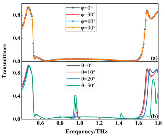 Due to the anisotropy of the medium, the filter is usually sensitive to the polarization angle. Whether the filter is polarization-sensitive or not is directly related to the universality of the device application and the difficulty of the operation, and this paper overcomes the polarization sensitivity problem by designing the filter structure as a centrosymmetric structure. To further investigate the transmission characteristics and polarization behavior of the wide-band filter, the transmission characteristics are simulated when the polarization angle varies from 0° to 90°. As shown in Figure 6a, the resonant frequency, bandwidth, and out-of-band rejection of the filter remain unchanged regardless of the change in polarization angle, and it can be said that the transmission characteristics hardly change, so the filter is insensitive to the polarization of incident electromagnetic waves. The response of the filter at different incident angles is also studied, as shown in Figure 6b, when the incident angle varies between 0° and 20°, the overall performance of the filter is relatively stable, and when the incident angle is larger than 20°, the overall performance of the filter is affected. It is mainly with the increase of the incident angle that an additional resonance appears in the middle of the broadband transmission spectrum, which is caused by the higher-order resonant modes in the filter.