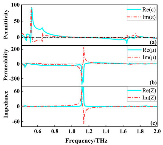 The effective permittivity and permeability can reveal the frequency dependence of the structure, which can be calculated according to the effective medium theory [19,20]. As shown in Figure 7a,b, the effective permittivity reaches its positive maximum at about 0.53 THz, where the effective permeability is much smaller than the effective permittivity, which leads to an extreme impedance mismatch. At this point the filter generates strong electrical resonance, almost all the energy of the incident electromagnetic wave is used to sustain the oscillation of the electrons inside the structure, so that at 0.53 THz the transmission curve of the filter falls straight down, which is the beginning of the whole wide band. At about 1.12 THz, the effective magnetic permeability reaches its negative maximum, which again leads to an extreme impedance mismatch that makes it impossible for the electromagnetic wave to pass through. As shown in Figure 7c, in the 0.53 THz–1.6 THz band, the effective permittivity and effective permeability always appear in one positive and one negative state, making this band in an extreme impedance mismatch. Meanwhile, we extracted the effective impedance of the filter, as shown in the Figure 7c, in the 0.53 THz–1.6 THz band, the effective impedance is almost zero, so the vast majority of electromagnetic waves cannot penetrate the structure, thus forming a wide rejection band with high absorption.