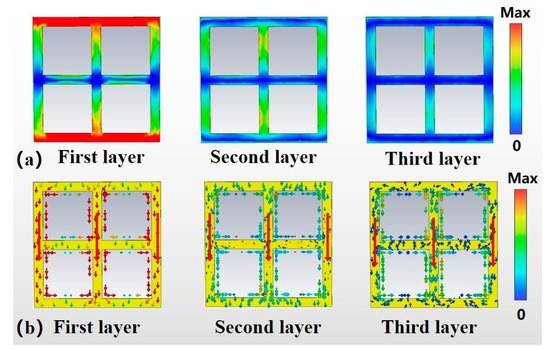 To further analyze the origin of the wide stopband of the metamaterial filter, the electric field intensity and surface current distribution of this filter at the center frequency f = 1.08 THz are investigated in this paper. As shown in Figure 8, it is noteworthy that the order of our metal layers is arranged along the direction of the incident wave. For the first layer, it can be seen that the strong electric field is mainly distributed in the upper and lower “sidearms” of the ring, and is centrosymmetric, which has the characteristics of electric dipole resonance; while the current is mainly concentrated in the three “vertical arms” of the ring, with the same current direction. The current is mainly concentrated in the three “vertical arms” of the metal ring, and the current direction is the same. The presence of strong electrical resonance makes it possible that when the frequency of the incident electromagnetic wave is equal to the resonant frequency, almost all the energy of the incident electromagnetic wave is used to maintain the oscillation of the electrons inside the structure, so that the energy of the electromagnetic wave passing through the metamaterial filter is zero, further demonstrating that the broadband resonance arises from the electric dipole resonance [21]. For the second layer of metal, there is no longer a significant strong electric field generated; the main flow of current is the same as in the first layer of metal. However, both the electric field and the currents are much smaller compared to the first layer of metals. For the third metal layer, there is no strong electric field generated and the current distribution is the weakest among the three layers. In general, the resonance strength of the filter decreases rapidly from the top to the bottom layer. It must be noted that each metal layer plays a different role. Specifically, the first metal layer and the second metal layer of the filter work together to produce a resonant peak, while the third metal layer has a much lower surface current than the first layer, and the resonant strength is too weak to form a resonant peak. However, the third metal layer plays the role of widening the resistive band and increasing the resistive band absorption and also optimizes the steep cut-off performance of the filter.