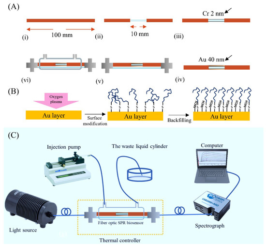 Figure 1A shows the fabrication process of the fiber-based SPR biosensor. Firstly, a 100 mm-length optical fiber with a 10 mm-length sensing area was prepared. The sensing area was scraped to wipe off the cladding layer. Then, the pretreated fiber was incubated in an acetone solution for 15 min and then washed three times using distilled water. Next, the fiber was dried out and embedded in a special fixture for a thermal evaporative coating. According to our previous research [26,27], a 2 nm-thick chromium film and a 40 nm-thick gold film as the optimization were deposited sequentially on the surface of the fiber. After that, the coated fiber was heated at the temperature of 80 °C for 2 h and then annealed to room temperature tardily to release the residual stress of coated layers. Next, the fiber surface was hydrophobically treated under oxygen plasma (Dongxin High-tech Automation Equipment Co., LTD., Shenzhen, China) for 30 s. Finally, in order to preserve the sensor’s integrity and biocompatibility, the fiber was encapsulated with a glass tube and standard SMA 905 interfaces and enclosed with the polyethylene microchamber.
