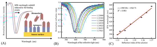 Figure 3. (A) The measurement principle of SPR biosensors. (B) The normalized spectrum of the sensor under solutions with different RIs. (C) The relationship between the SPR wavelength and the refractive index of the solutions.
