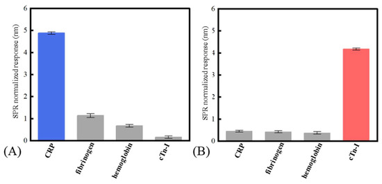 Figure 5. The selectivity of the biosensor: (A) the sensor modified with the CRP aptamer; (B) the sensor modified with the cTn-I aptamer.