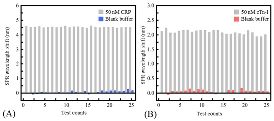 where σ background referred to the standard deviation of the wavelength shift of the SPR biosensor. S background referred to the biosensor’s sensitivity near the blank sample (obtained by calculating the slope of the fitted curve near the blank sample). According to the experiment results, the LOD of the SPR biosensor to the CRP and cTn-I was 1.7 nM (0.204 μg/mL) and 2.5 nM (57.5 ng/mL), respectively. In addition, solutions of 100 nM CRP, 100 nM hemoglobin, 100 nM fibrinogen, and 100 nM cTn-I were used to evaluate the specificity of the fiber-based SPR sensor. Figure 5A,B showed the specificity of the SPR sensor modified with CRP aptamer and the cTn-I aptamer, respectively. From the results, the nonspecific binding responses between the sensor and the disturbed biomolecules were less than 20% of the specific binding between the sensor and the certain inflammation biomarkers, indicating that the aptamer chosen had a prominent affinity to the corresponding biomarkers and the conspicuous stain resistance of the SAM made of MCH. Figure 6A,B shows the sensor’s repeatability. The sensor’s responses to the 50 nM of CRP and 50 nM of cTn-I were measured repeatedly. It could be seen that the relative standard deviation values of the sensor’s response to CRP and cTn-I were only 2.15% and 4.72%, respectively, indicating that the proposed biosensor had a good ability to reuse because of the robust surface modification protocols.