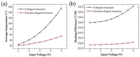 (a) The steady-state average temperature, (b) Heating efficiency for the S-shaped and the Circular-shaped structure with different input voltage.