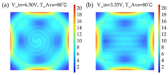 The internal thermal stress distribution of (a) Circular-shaped structure, and (b) S-shaped structure with the same steady-state average temperature of 80 °C.