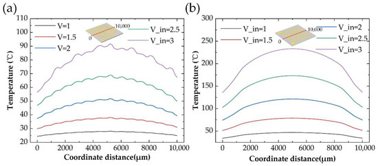 Usually, temperature uniformity is a key factor to evaluate the performance of a heater, we choose the temperature distribution along the center line to get a quantitative evaluation. As shown in Figure 6, the temperature uniformity of the S-shaped structure in Figure 6a is better than that of the Circular-shaped in Figure 6b. We noticed that there was temperature fluctuation of the Circular-shaped wire structure along the center line. In addition, these fluctuation-generated positions were exactly the positions of the heating wires. Considering the shape of the Circular-shaped wire structure, the fluctuation should result from the heat accumulation near the heating wire with large curvature.