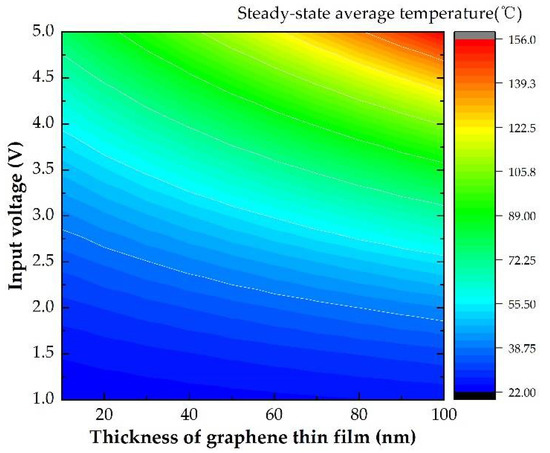 Other than the wire shape design, the thickness of the graphene thin film also has a certain influence on the heating efficiency of the microheater. The steady-state average temperature for the S-shaped structure corresponding to different voltage and different thickness of the graphene thin film was evaluated as in Figure 7. Graphene thin film can be beneficial to the heating efficiency of the microheater, but they are not a linear relationship.