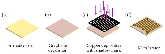For the real application of the proposed microheaters, we proposed a feasible preparation method for the designed microheaters. The preparation process flow was shown in Figure 8. With a suitable PET substrate as in Figure 8a, low-pressure chemical vapor deposition (LPCVD) can be applied for graphene middle layer deposition as in Figure 8b. After that, copper wire can be directly deposited with the evaporation method using a shadow mask as in Figure 8c. Finally, the proposed microheater can be fully fabrication as in Figure 8d.