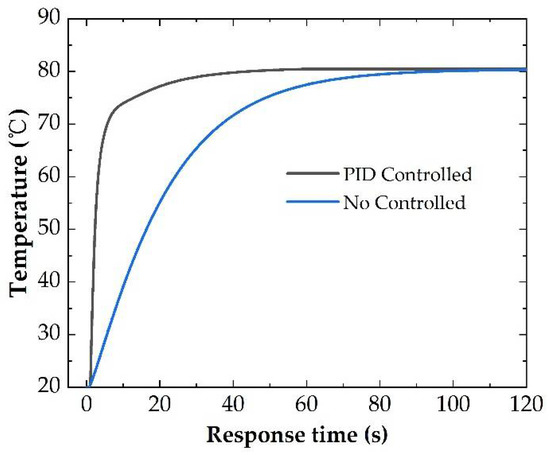To reach the set temperature as soon as possible, we designed the PID control model with COMSOL software. For the PID control model, the input voltage was the controlled parameter and the average temperature of the heater was applied as a feedback factor. With an optimized PID control model for a microheater with an S-shaped structure and 50 nm thickness of graphene thin film, we can get the target temperature within 10 s which is more than 60 s without a PID control model as in Figure 9. The optimized PID values would be related to the heat dissipation environment which should be designed for real application.