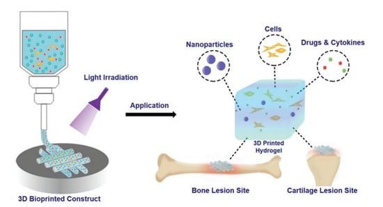 Figure 1. Schematic illustration of photo-crosslinkable hydrogels for the bioprinting of bone and cartilage [23].