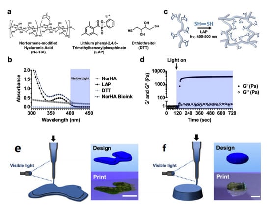 Figure 2. NorHA bioink composition and crosslinking. (a) Chemical structures of components incorporated into NorHA bioinks and their (b) absorption spectra, including for NorHA, LAP, DTT, and their combination, into a single bioink formulation (triangle). (c) Schematic of thiol-ene reaction employed to crosslink the NorHA bioink. (d) Representative photorheology time sweep during the photo-crosslinking of the NorHA bioink. (e) Schematic of in situ crosslinking method and CAD design and representative image of a printed construct for designs of a model femoral condyle and a disc (f). Reproduced with permission from Galarraga J. H., Biofabrication; published by IOP publishing Ltd., 2022.