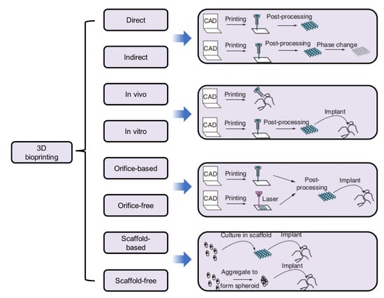 As a novel 3D technology, bioprinting has received increasing attention worldwide and is widely applied for broad-spectrum applications in regenerative medicines, tissue engineering and transplantation, the pharmaceutical field [100], and the classifications of 3D bioprinting according to various characteristics. Their design and their applications in different fields are shown in Figure 4.