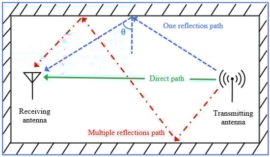 In wireless communication systems, the positions of user terminals are generally not fixed. They might be randomly oriented to transmitter antennas, thereby weakening the receiving signals; this condition is known as the polarisation mismatch effect [4]. Figure 2 was redrawn from [5] and described the IWC propagation scenario within an indoor environment. The probability of this effect occurring increases in an indoor environment because transmitted signals are reflected from ceilings, walls and other obstacles, as observed in Figure 2. Hence, the original signals that reach the user terminals exhibit different polarisation senses [5,6].