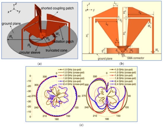 K. He [45] presented an indoor antenna structure as shown in Figure 3. The main parts of the proposed design structure include a circular ground plane, truncated cone feeding, three radiator patches connected to the truncated cone and three loaded coupling patches connected to the ground plane by three shorted strips. The ripple levels of the radiation patterns for the horizontal plane are less than 1.5 dB at 1.0, 1.8 and 2.4 GHz. Though the ripple levels increased at the higher frequency, Figure 3c shows the characteristic of omnidirectional radiation in the H-plane.