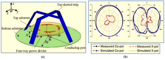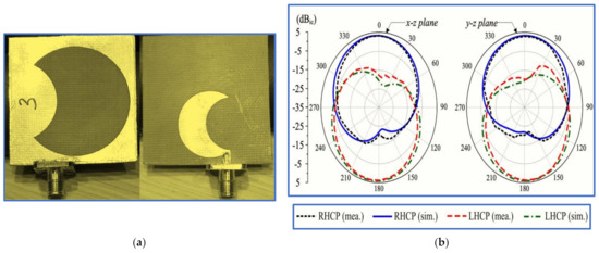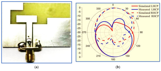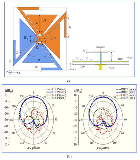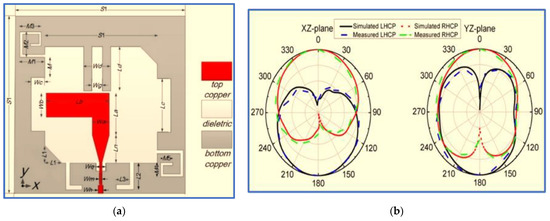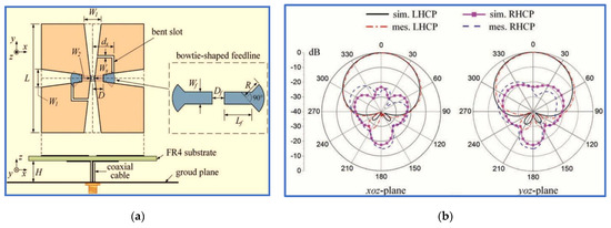 A proposed CP antenna: (a) geometry and (b) radiation pattern at 2.4 GHz [51].