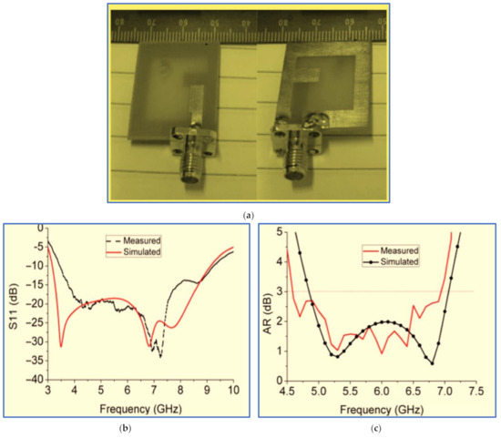 (a) Front and back views of a square CP slot antenna. (b) Simulated and measured S11 results. (c) Simulated and measured AR results [89].