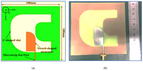 Geometry of a C-shaped slot antenna: (a) the dimensions of the proposed antenna and (b) the fabricated design [11].