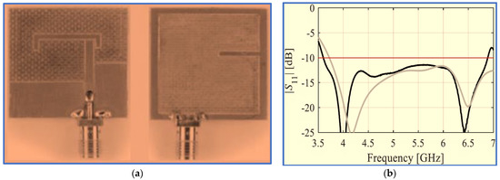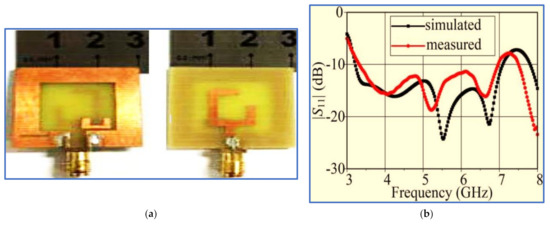 Configurations of the finalized antenna. (a) Configuration of inverted L-shaped slot antenna. (b) Simulated and measured antenna radiation patterns at 5.9 GHz [99].
