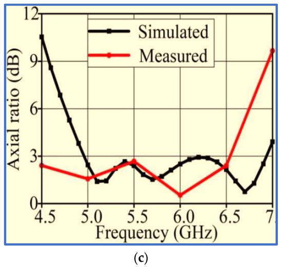 A novel slot antenna was proposed by [87]. The first IBW of 3.5 GHz was produced using a straight microstrip feed line. A wide rectangular slot was also cut in the ground plane, as depicted in Figure 10a. By introducing a horizontal stub to the right side of the ground plane slot and a vertical stub to the top left of the feedline, a slight improvement was achieved for the lower and upper-frequency bands. Meanwhile, the AR values were greatly affected, dropping from 30 dB to 2 dB at the middle frequencies. This enhancement was attributed to the stub supporting the horizontal electric component. A new technique was proposed for broadening the IBW and ARBW; this technique involves shifting the microstrip feed line to the right edge of the rectangular slot. Figure 10b,c show the rectangular slot antenna with measured IBW and ARBW of 90.2% (3.5–9.25 GHz) and 40% (4.6–6.9 GHz), respectively. Although the new technique can expand CP bands, it realises a narrow ARBW with an extremely low overlapping ratio of 40%.