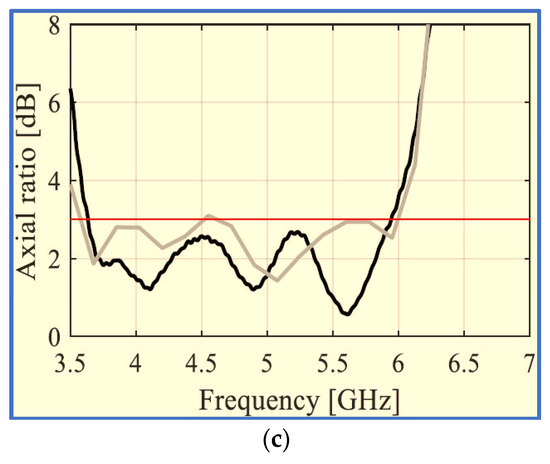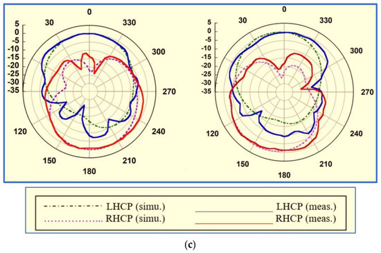Although the proposed antenna provides a large IBW which covers many of the upper-frequency bands of wireless communication systems, such as WLAN and WiMAX, with acceptable gain, its ARBW is narrow; thus, the antenna is unable to provide a broad CP bandwidth for the achieved broad IBW (the overlapping ratio between the two bands is 48%). As observed in Figure 9c, a bidirectional radiation pattern (LHCP and RHCP) was produced with more than 10 dB isolation. However, the radiation patterns were slightly distorted and tilted, possibly because of the use of the asymmetric ground plane.