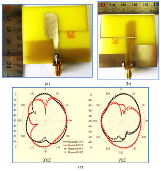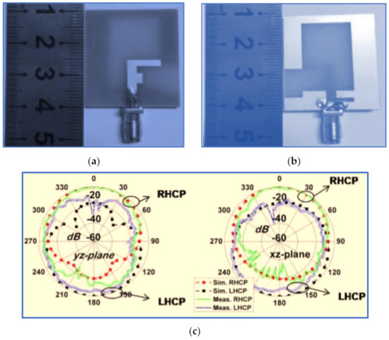 Geometry of a CP slot antenna with coplanar strip: (a) front side; (b) back side; (c) simulated and measured CP radiation pattern in the xz-plane RHCP and LHCP at 2.5 GHz [24].