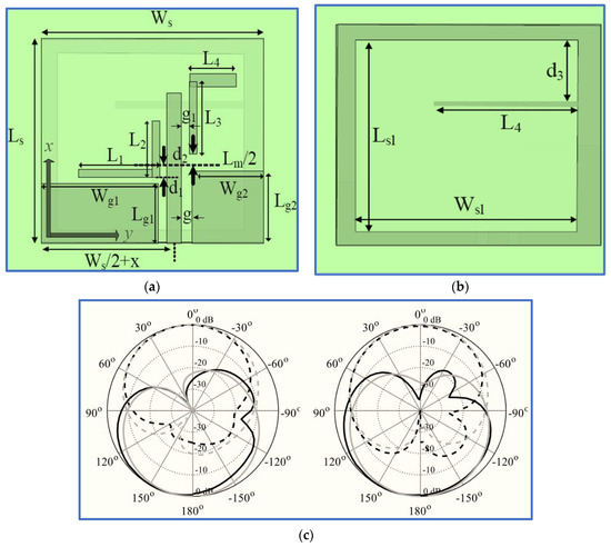 Hence, Gyasi et al. [91] proposed a new antenna structure to overcome the aforementioned limitation by designing a broadband CP antenna with an IBW and ARBW broader than 80% whilst maintaining a compact antenna size. The proposed design consists of a simple F-shaped radiator and linked rectangular and inverted L-shaped slots in the ground plane conductor (Figure 14). Additionally, a bidirectional pattern is observed with RHCP in the +z direction and LHCP in the –z-direction over the whole bandwidth. In order to achieve a unidirectional pattern, a metallic reflector could be employed at a λ/4 distance from the antenna, as shown in Figure 14c.