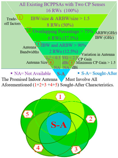 Printed antennas are receiving considerable attention with regard to their use in indoor environments because of their compact size, low profile, simple design, uncomplicated design and fabrication and low production cost [10,16,17,18], in addition to their capabilities of generating CP waves whilst retaining a compact antenna size [19,20] and providing bidirectional radiation patterns, RHCP and LHCP; these properties are essential for antennas which are used in indoor environments [21]. However, these types of antennas suffer from the difficult trade-off between the achieved IBW and axial ratio bandwidth (ARBW) and their size [22,23,24,25,26].