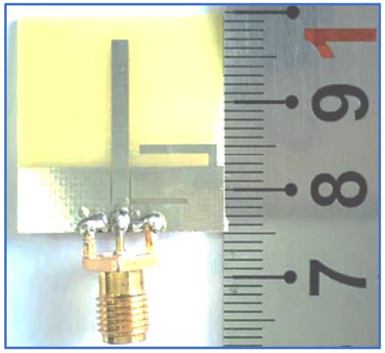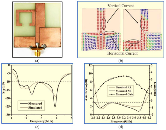Ullah and Koziel [24] presented a simple coplanar strip technique with CPW feeding for the design of slot CP antennas for broadband wireless communication systems. The technique involves a simple straight radiator and two inverted L-shaped parasitic strips placed coplanar to the straight monopole (Figure 17). Strong vertical and horizontal electric field components were realised due to the excitation of the current distribution on the straight monopole and ground slot. The IBW and ARBW were thus improved.