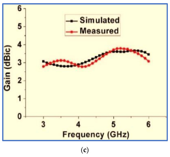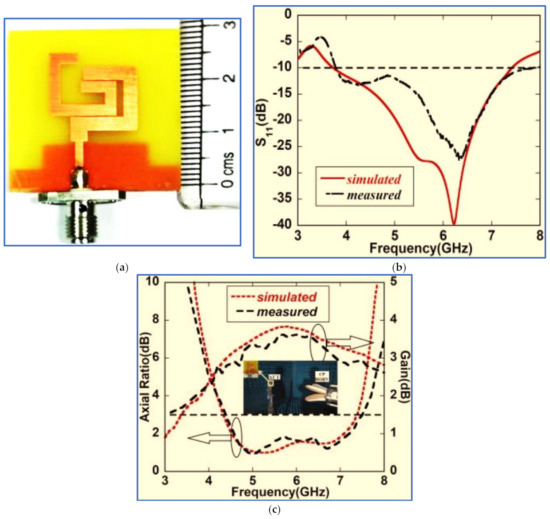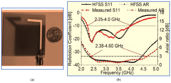 The simulation and measurement results showed good agreement. As shown in Figure 17, the measured IBW and ARBW are 72% (2.2–4.85 GHz) and 66% (2.4–4.87 GHz), respectively. The measurement results indicated that the proposed antenna has broad IBW and ARBW with a high overlapping ratio. However, the response bands need to be extended towards the lower and upper frequencies to cover most wireless communication bands, such as GSM and the lower and upper WLAN and WiMAX bands. The wireless device works at 5.15–5.35 and 5.725–5.825 GHz. Several researchers have focused on the development of a CPW-fed BCPPSA, including its working principle, technical specifications and analysis [100,101].