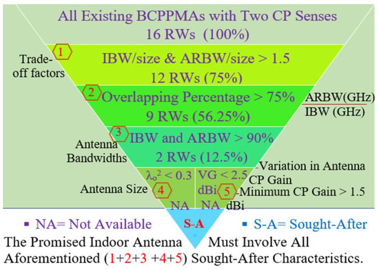 Modern wireless communication systems require circular polarisation more than they do linear polarisation, especially when the transmitter and receiver antennas are not in polarisation alignment, because a CP antenna can reduce the polarisation mismatch between the transmitter and the receiver [77,78]. Moreover, using CP antennas can minimise the Faraday rotation effect to provide a stable communication link and to mitigate multipath interference [79,80], BCPPAs are preferred in modern wireless communication as they can meet all existing requirements. BCPPAs are thus suitable choices for compact antennas with a broadband CP property and compact patch antennas with broad IBW and ARBW.
