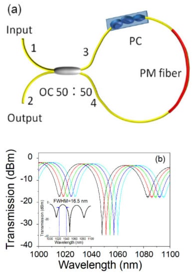 2]. Various approaches have been exploited to achieve multi-wavelength by inserting several filters either into actively or passively mode-locked fiber laser cavity as wavelength selection devices, such as a birefringent filter, Mach–Zehnder interferometer, fiber Bragg grating, Sagnac loop filter, long-period grating, and fiber filter. In 2008, Tu et al., used a Mach–Zehnder interferometer to obtain stable eight lasing wavelengths in Yb-doped fiber laser [