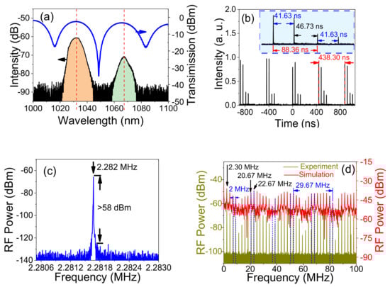 Figure 3d). Because of the two different frequency elements, two modulation envelopes coexist in the RF spectrum with the periods of 22.67 MHz and 20.67 MHz, and they correspond to the time spacing of 41.63 ns and 46.73 ns in the pulses train, as shown in